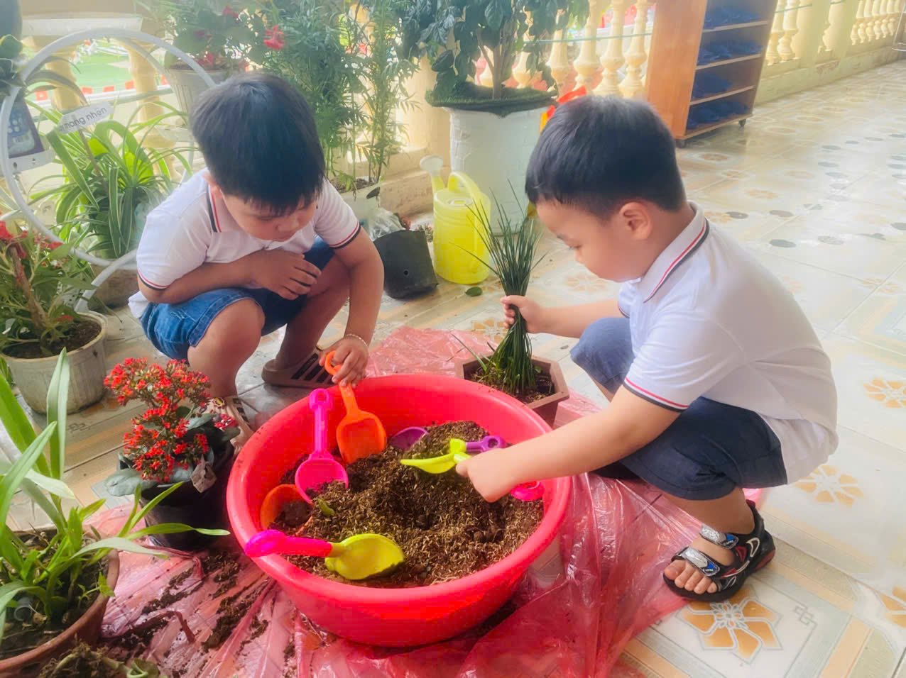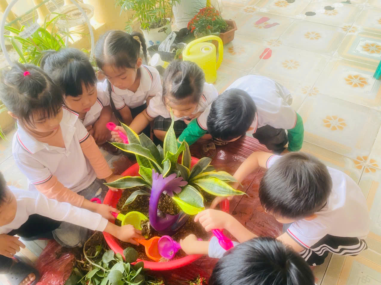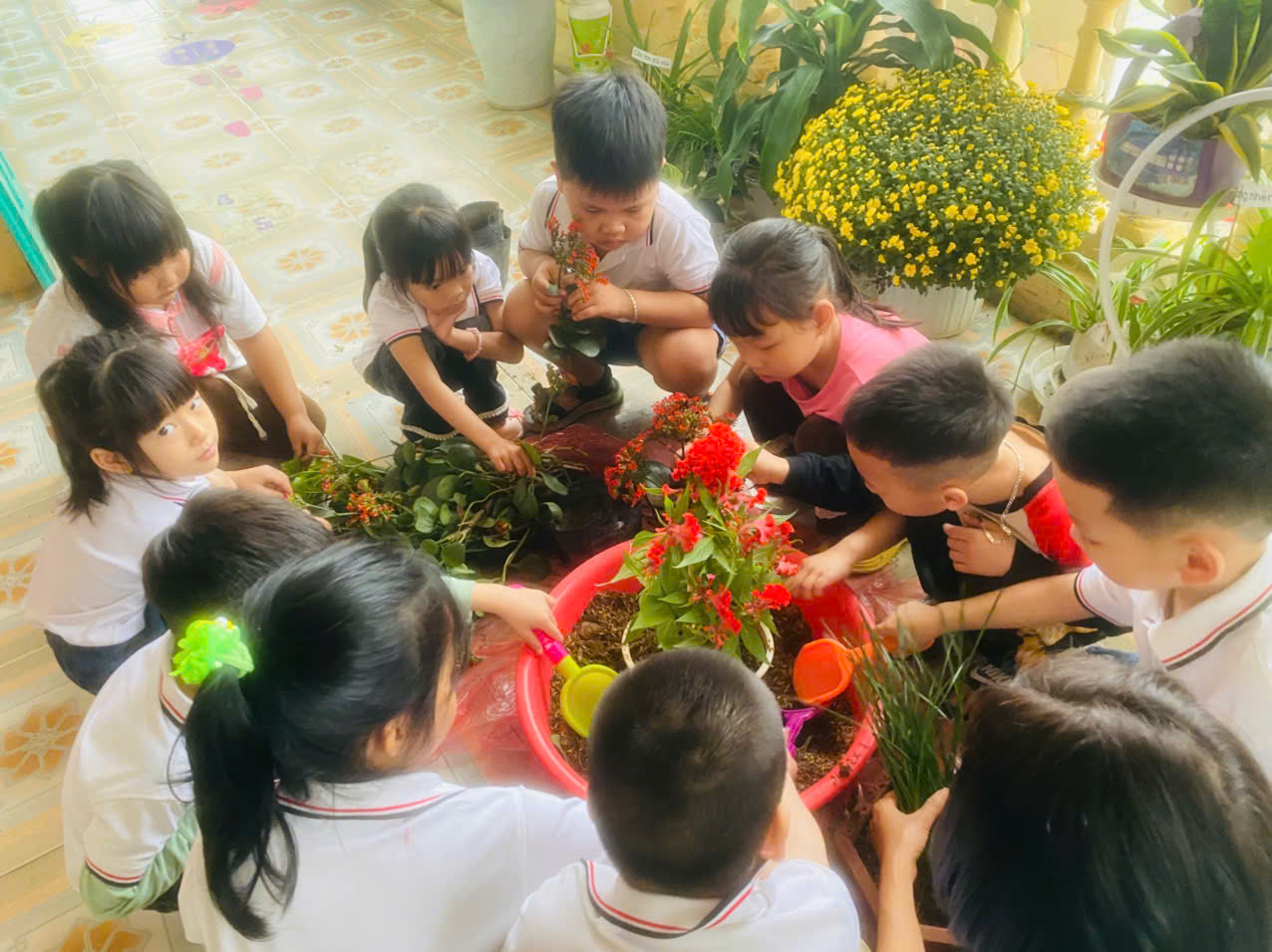 Trong không khí vui tươi và hào hứng, các con được cô giáo hướng dẫn cách trồng cây, tưới nước và chăm sóc cây. Bạn nào cũng rất thích thú khi tự tay vun đất, đặt cây vào chậu và nhẹ nhàng tưới nước cho cây. Những bàn tay nhỏ bé nhưng tràn đầy sự chăm chút đã góp phần tạo nên những mầm xanh tươi tốt.