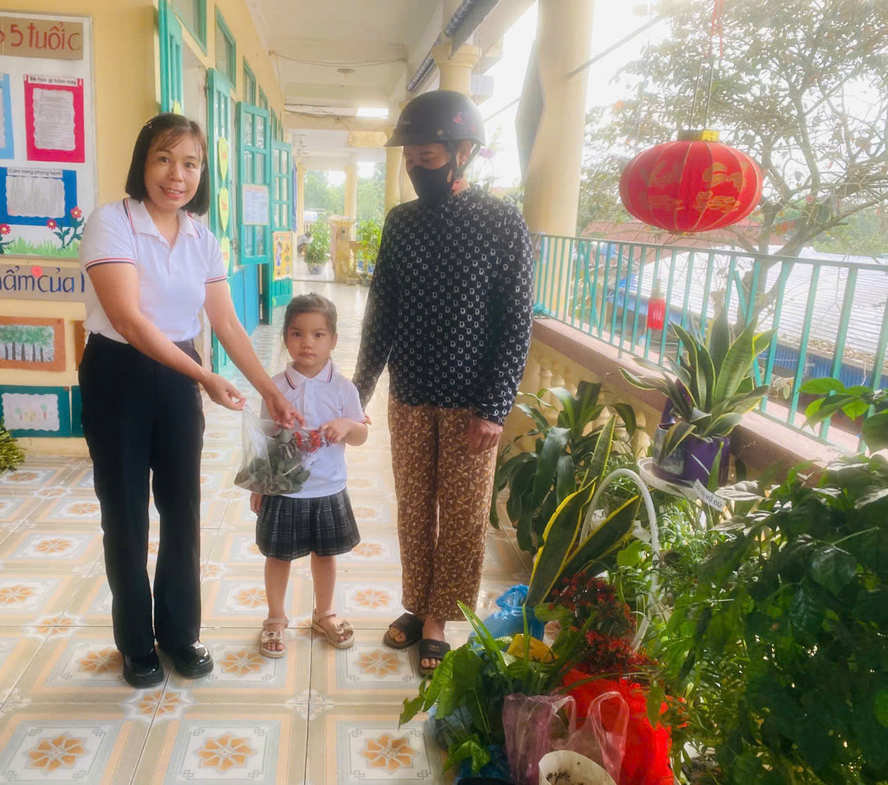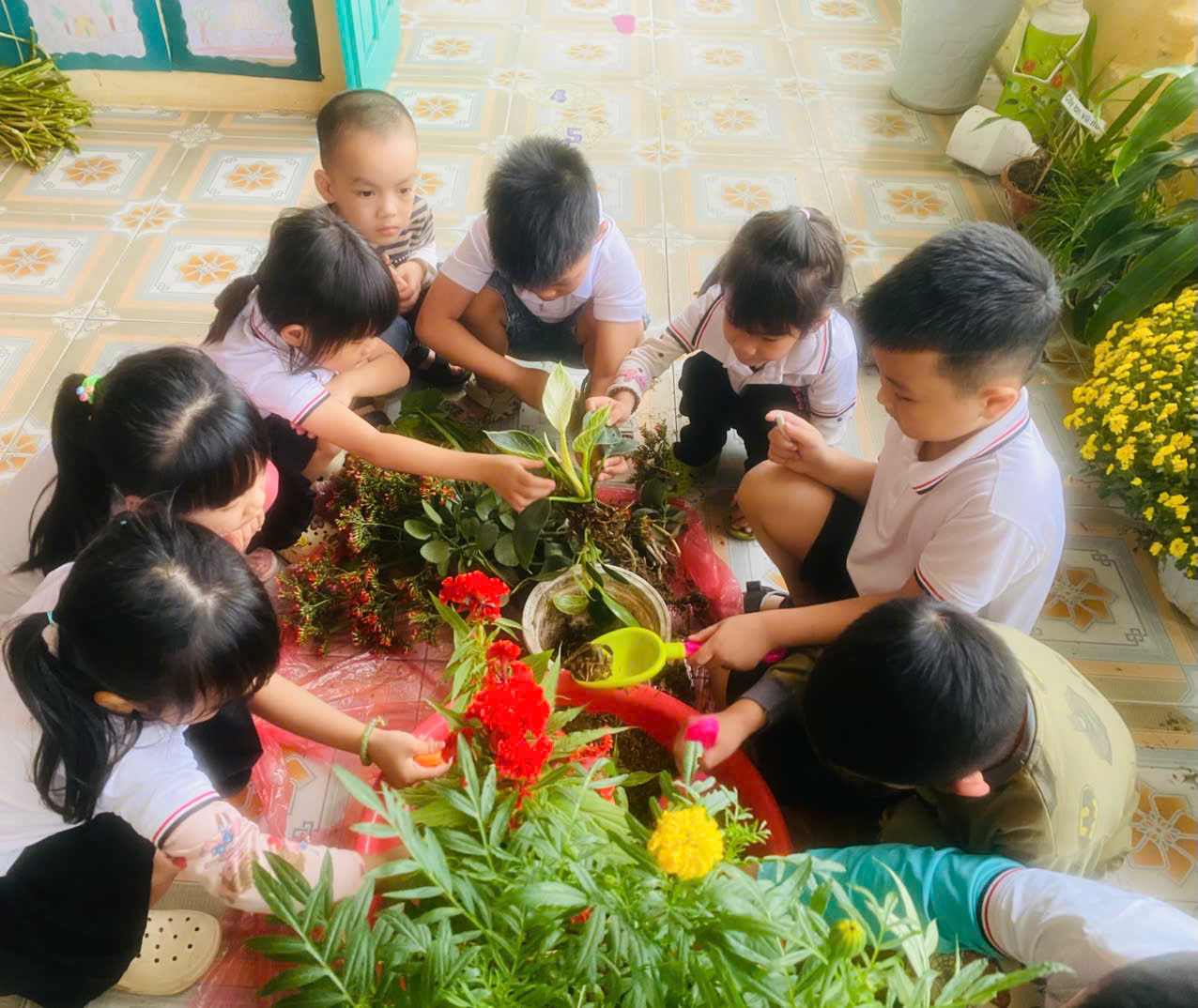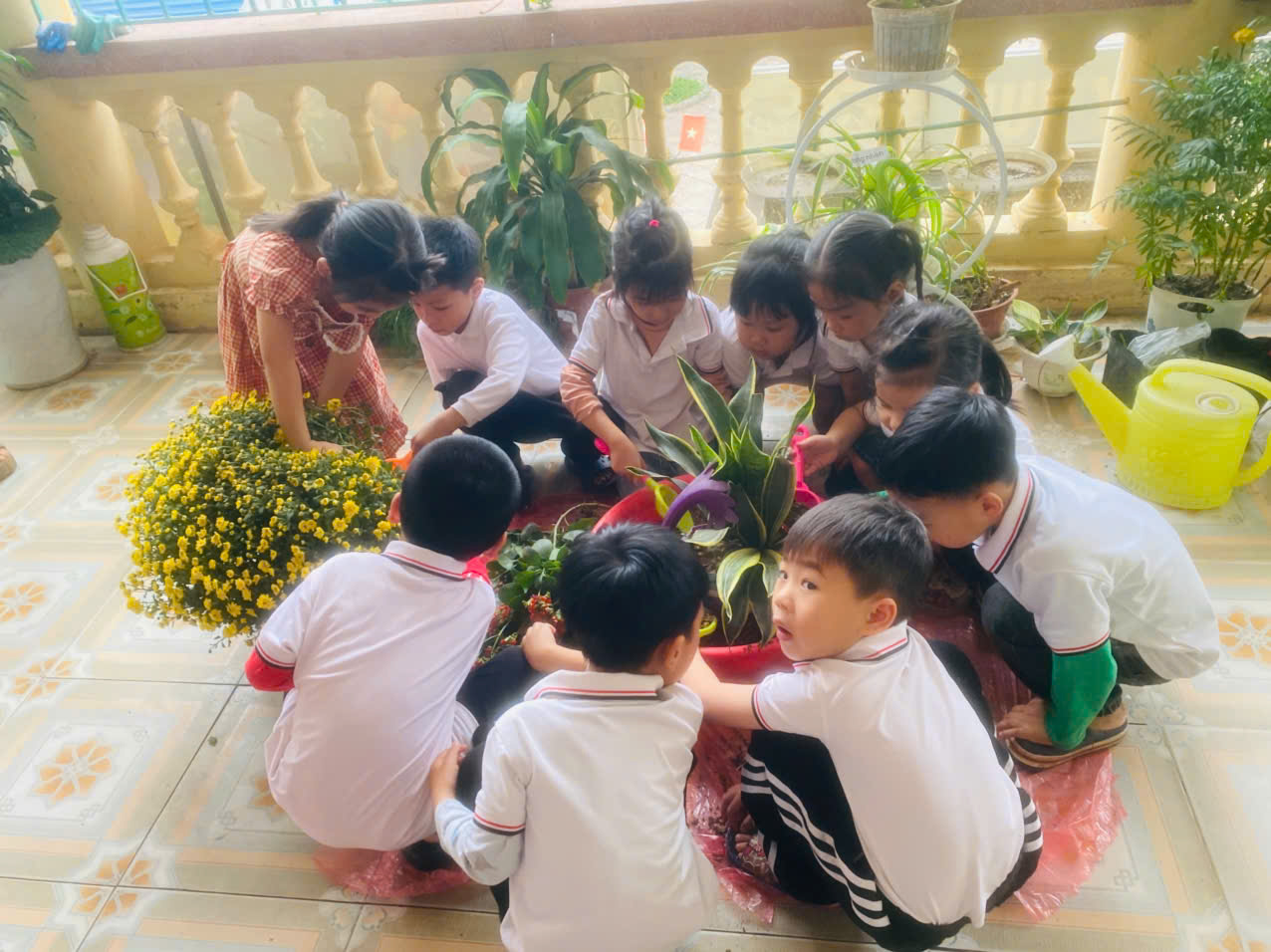Trong không khí vui tươi và hào hứng, các con được cô giáo hướng dẫn cách trồng cây, tưới nước và chăm sóc cây. Bạn nào cũng rất thích thú khi tự tay vun đất, đặt cây vào chậu và nhẹ nhàng tưới nước cho cây. Những bàn tay nhỏ bé nhưng tràn đầy sự chăm chút đã góp phần tạo nên những mầm xanh tươi tốt.