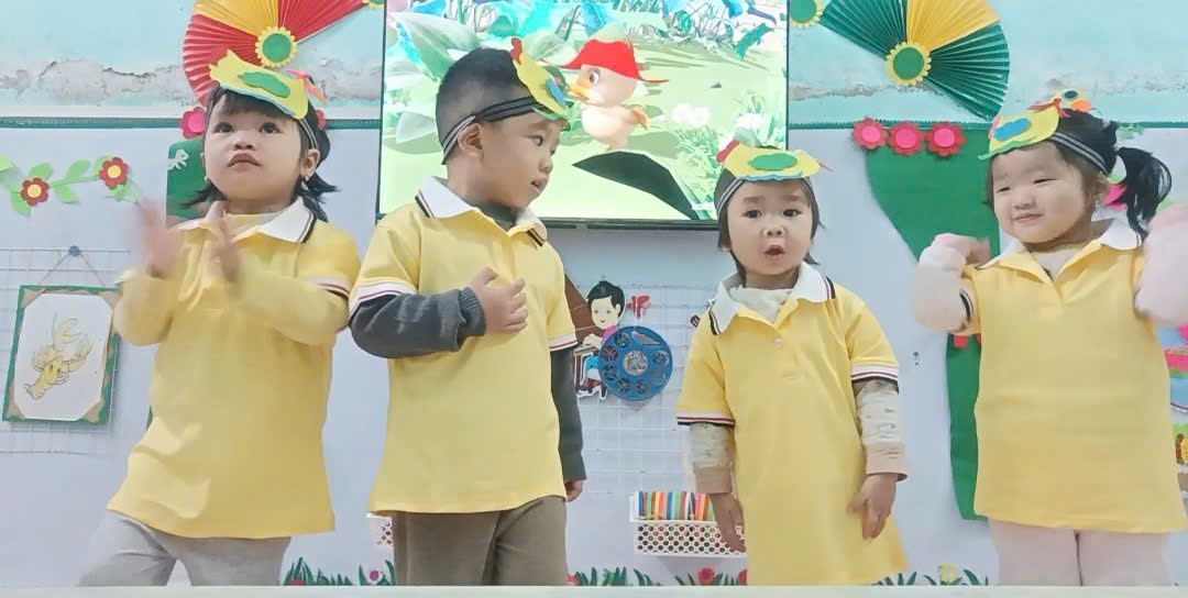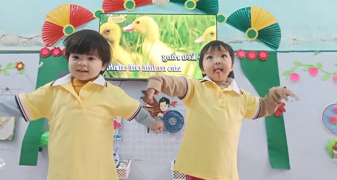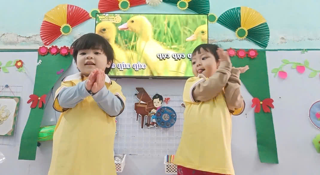 Dưới sự hướng dẫn của cô, các bé thực hiện những động tác đơn giản như vỗ tay, lắc lư, bước đi theo nhịp và bắt chước dáng đi đáng yêu của chú vịt. Hoạt động giúp trẻ phát triển vận động, tăng khả năng cảm thụ âm nhạc và sự tự tin khi tham gia tập thể.