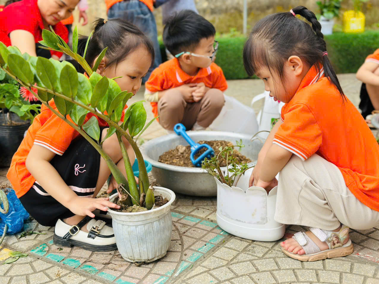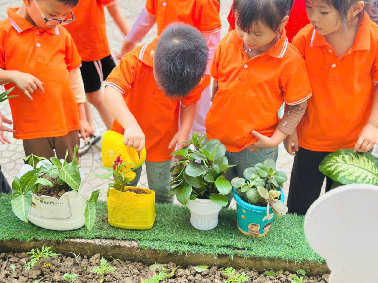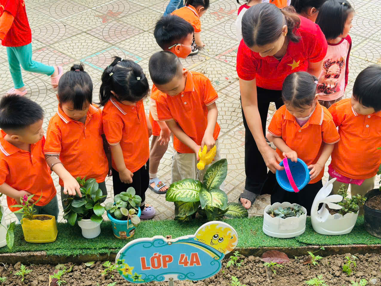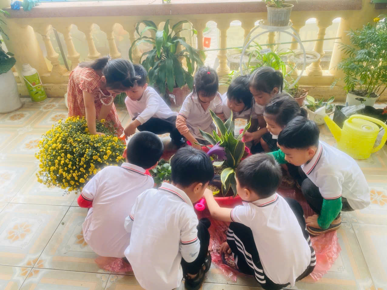 Các con được cô giáo hướng dẫn những thao tác đơn giản như xúc đất, giữ chậu và tưới nước, thực hành các bước: tự tay cho đất vào chậu, đặt cây ngay ngắn, lấp đất vừa đủ, nén nhẹ gốc cây và tưới nước đúng cách. Sau khi trồng xong, các lớp còn phân công nhau chăm sóc cây hằng ngày như quan sát độ ẩm của đất, nhắc nhau tưới nước, lau lá và theo dõi sự phát triển của cây.