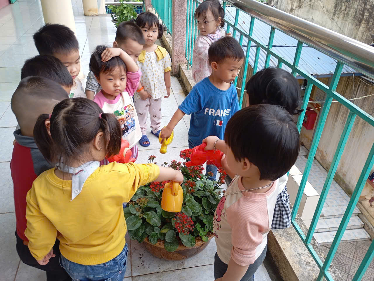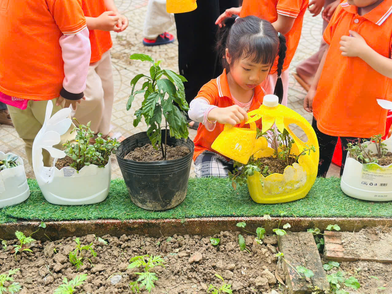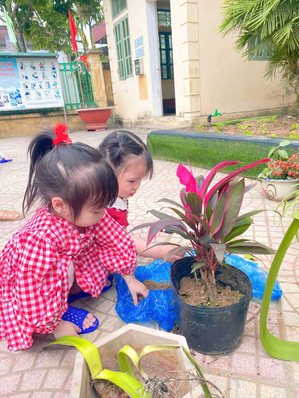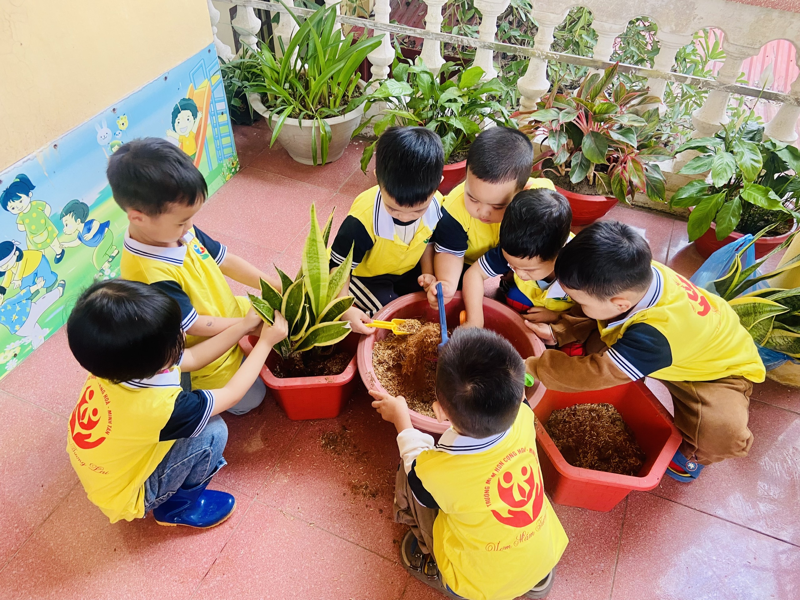 Các con được cô giáo hướng dẫn những thao tác đơn giản như xúc đất, giữ chậu và tưới nước, thực hành các bước: tự tay cho đất vào chậu, đặt cây ngay ngắn, lấp đất vừa đủ, nén nhẹ gốc cây và tưới nước đúng cách. Sau khi trồng xong, các lớp còn phân công nhau chăm sóc cây hằng ngày như quan sát độ ẩm của đất, nhắc nhau tưới nước, lau lá và theo dõi sự phát triển của cây.