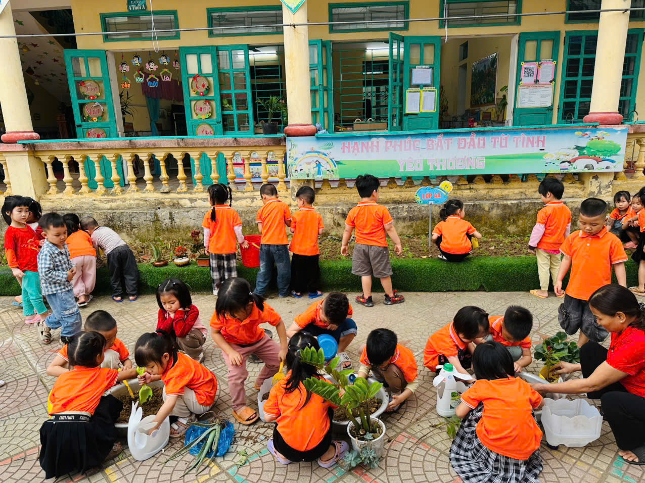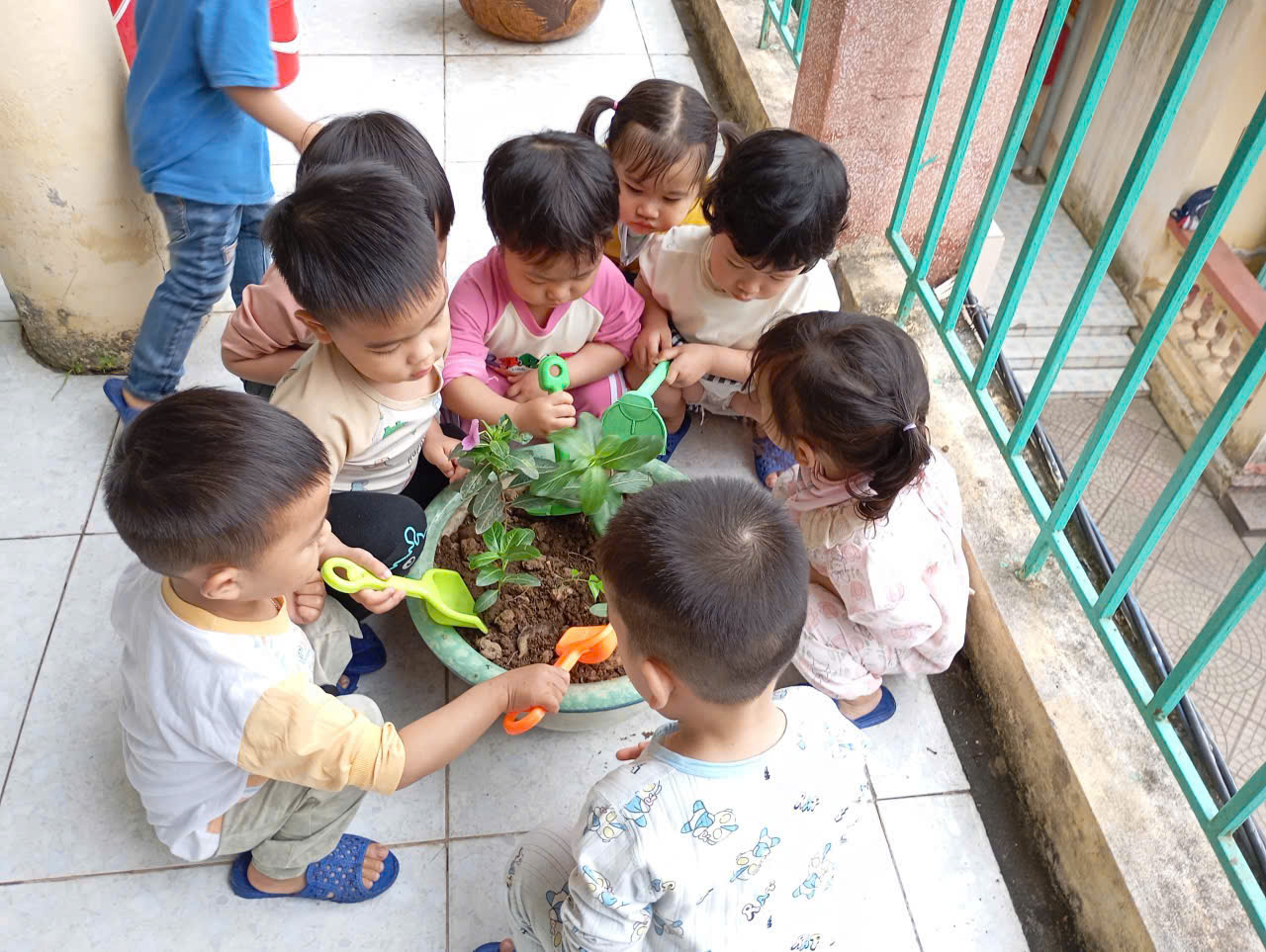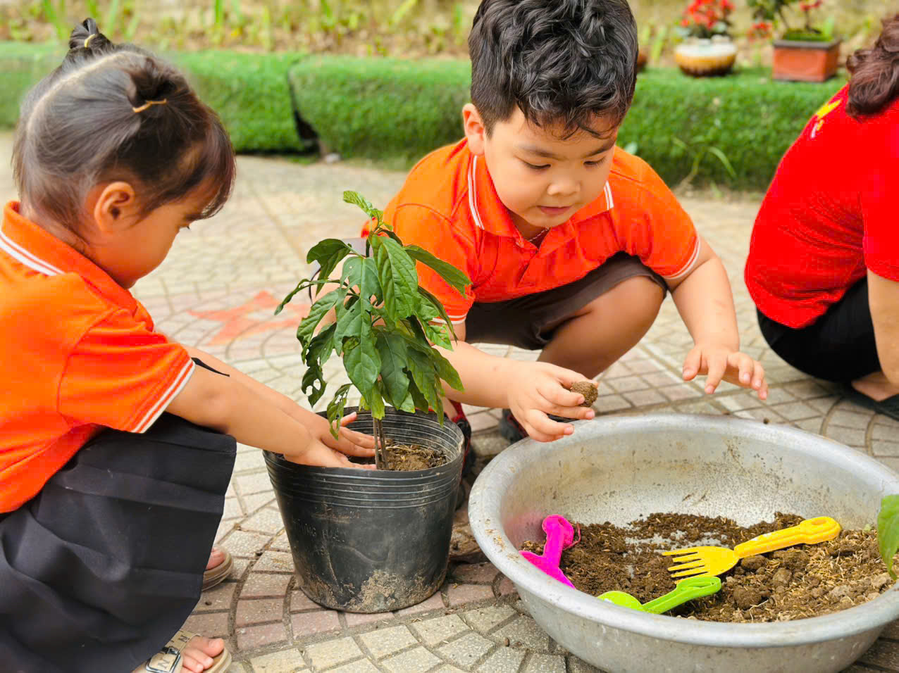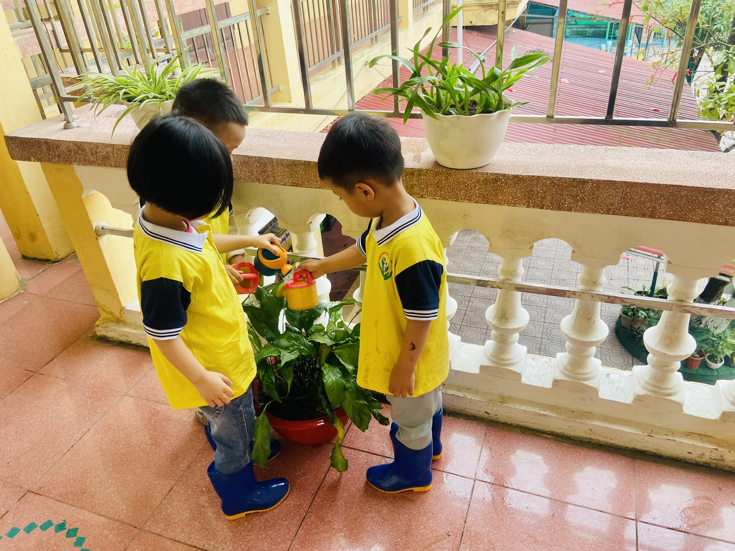 Các con được cô giáo hướng dẫn những thao tác đơn giản như xúc đất, giữ chậu và tưới nước, thực hành các bước: tự tay cho đất vào chậu, đặt cây ngay ngắn, lấp đất vừa đủ, nén nhẹ gốc cây và tưới nước đúng cách. Sau khi trồng xong, các lớp còn phân công nhau chăm sóc cây hằng ngày như quan sát độ ẩm của đất, nhắc nhau tưới nước, lau lá và theo dõi sự phát triển của cây.