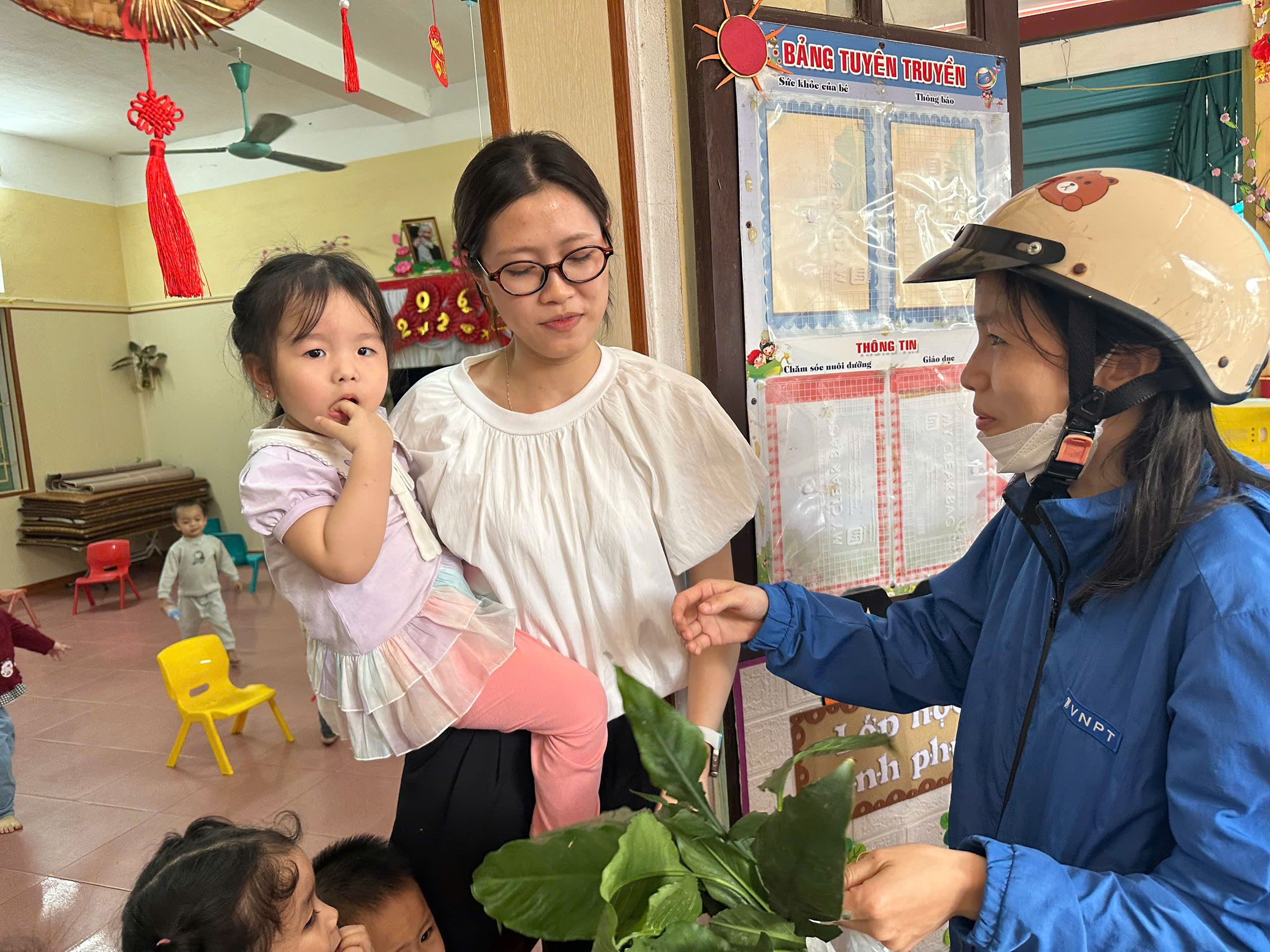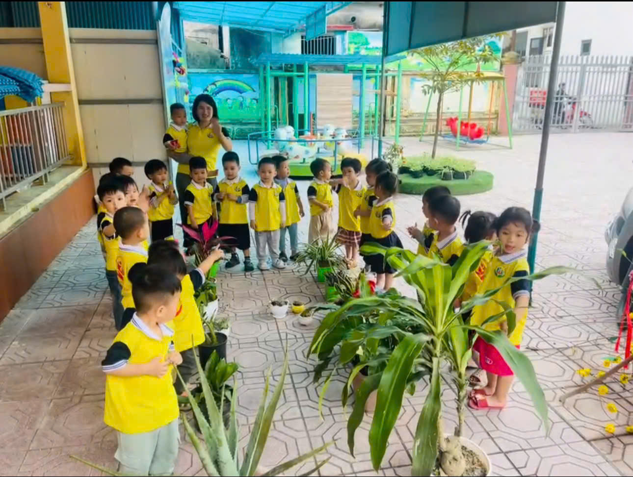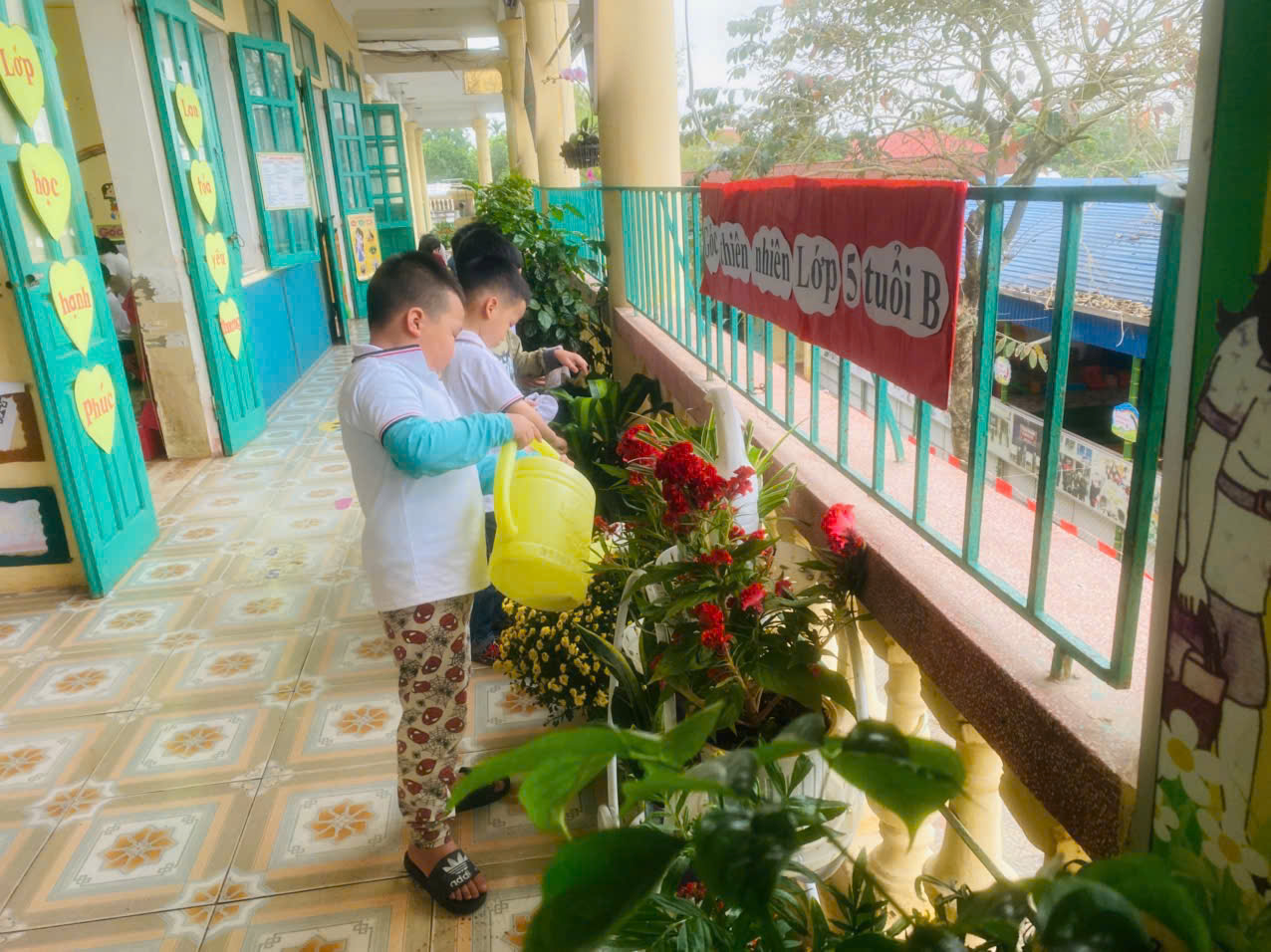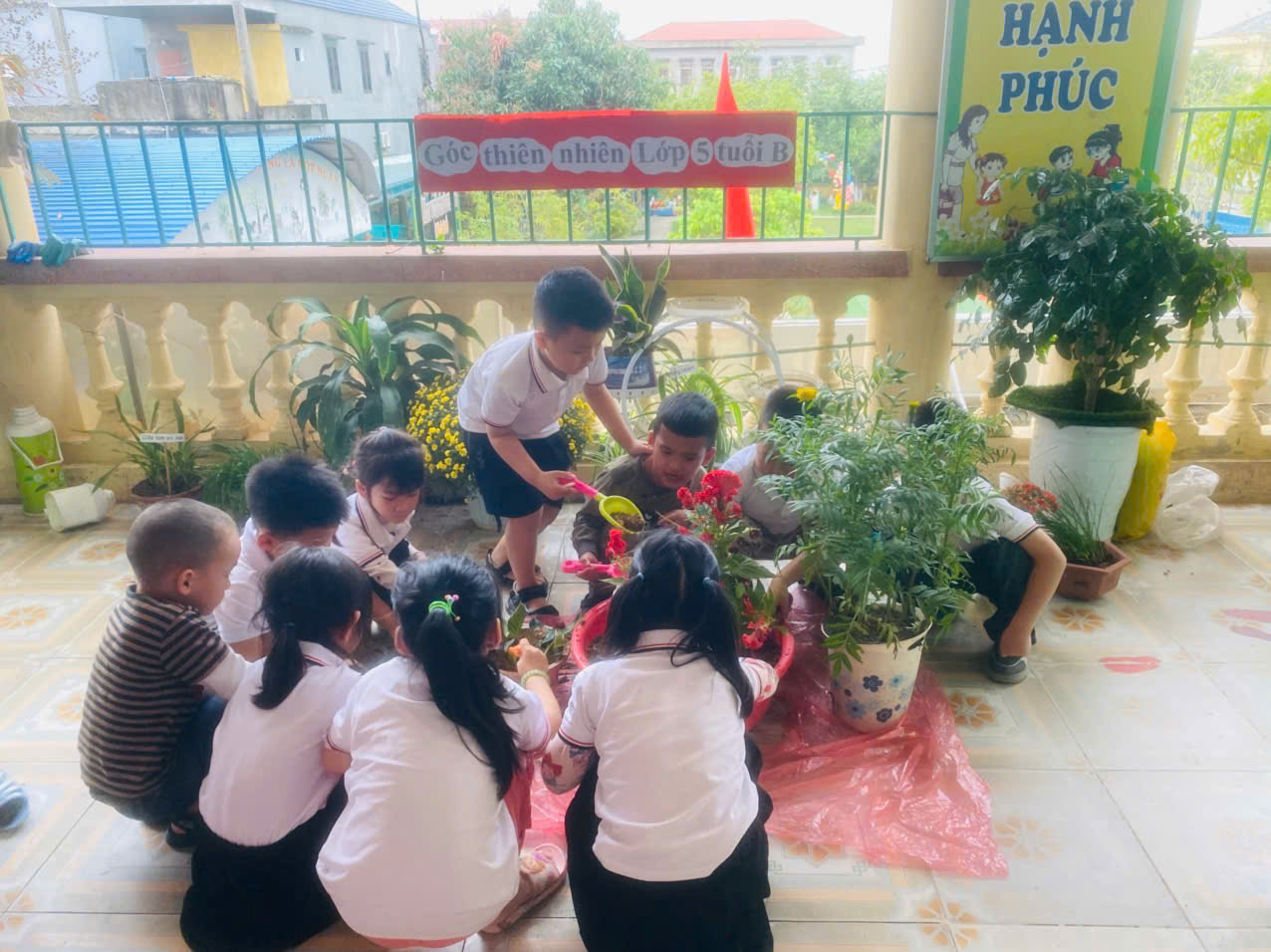 Các con được cô giáo hướng dẫn những thao tác đơn giản như xúc đất, giữ chậu và tưới nước, thực hành các bước: tự tay cho đất vào chậu, đặt cây ngay ngắn, lấp đất vừa đủ, nén nhẹ gốc cây và tưới nước đúng cách. Sau khi trồng xong, các lớp còn phân công nhau chăm sóc cây hằng ngày như quan sát độ ẩm của đất, nhắc nhau tưới nước, lau lá và theo dõi sự phát triển của cây.